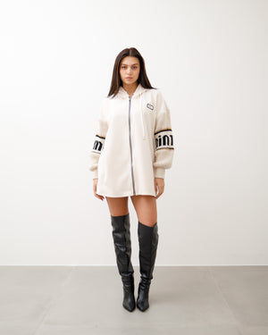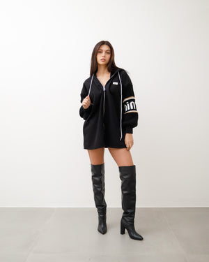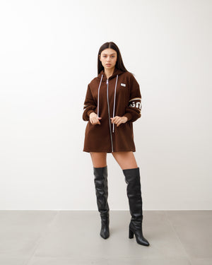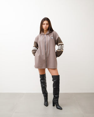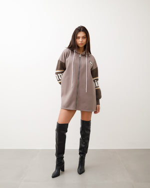 Abito corto dal design contemporaneo e disinvolto ⭐, caratterizzato da una silhouette dritta e confortevole 🤍. Il modello presenta un cappuccio con coulisse 🎯 e una chiusura frontale con zip a tutta lunghezza, che aggiunge un tocco pratico e urbano ✨.
