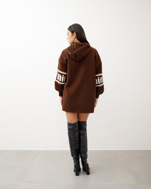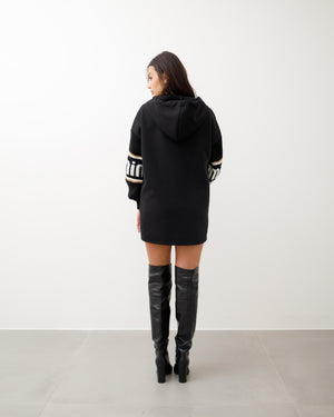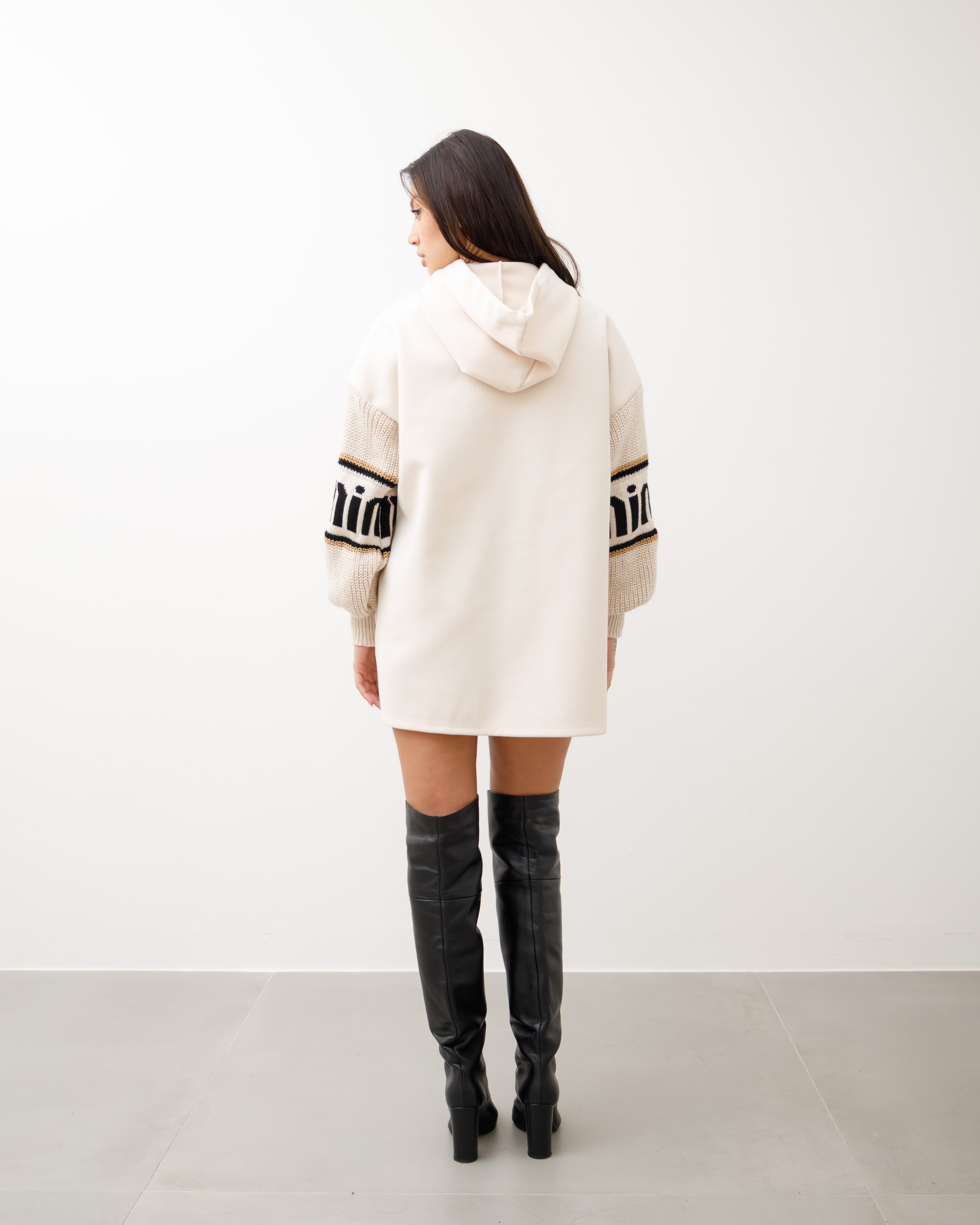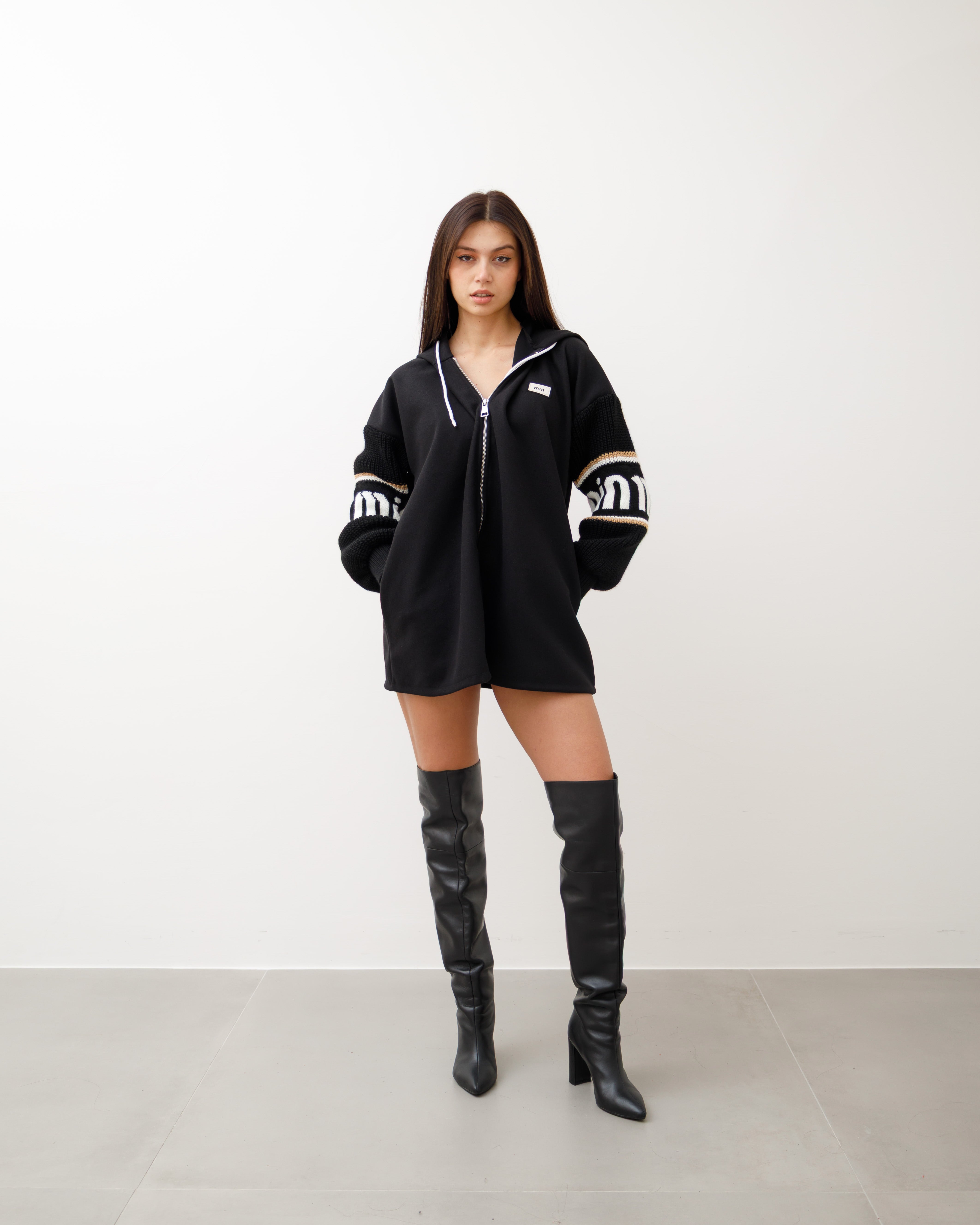 Le maniche in maglia lavorata donano texture e personalità al capo ⭐, creando un interessante gioco di materiali 🔥. La lunghezza sopra il ginocchio valorizza la figura 💫, rendendolo ideale da indossare sia come abito che come maxi felpa, perfetto per look casual ma ricercati ⭐✨.