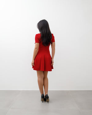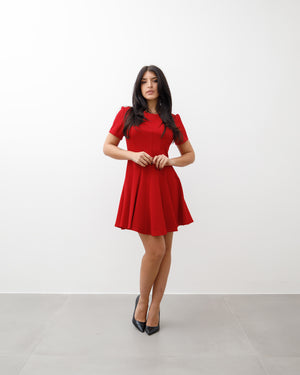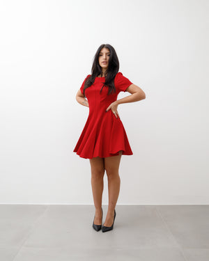L’abito è corto, di colore rosso acceso, con una linea femminile ed elegante.