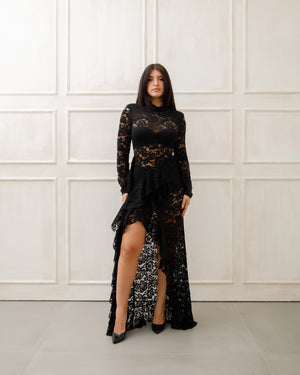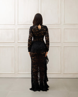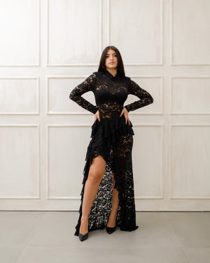 Realizzato interamente in raffinato pizzo nero, avvolge la silhouette valorizzandola con eleganza.