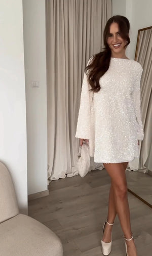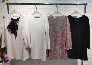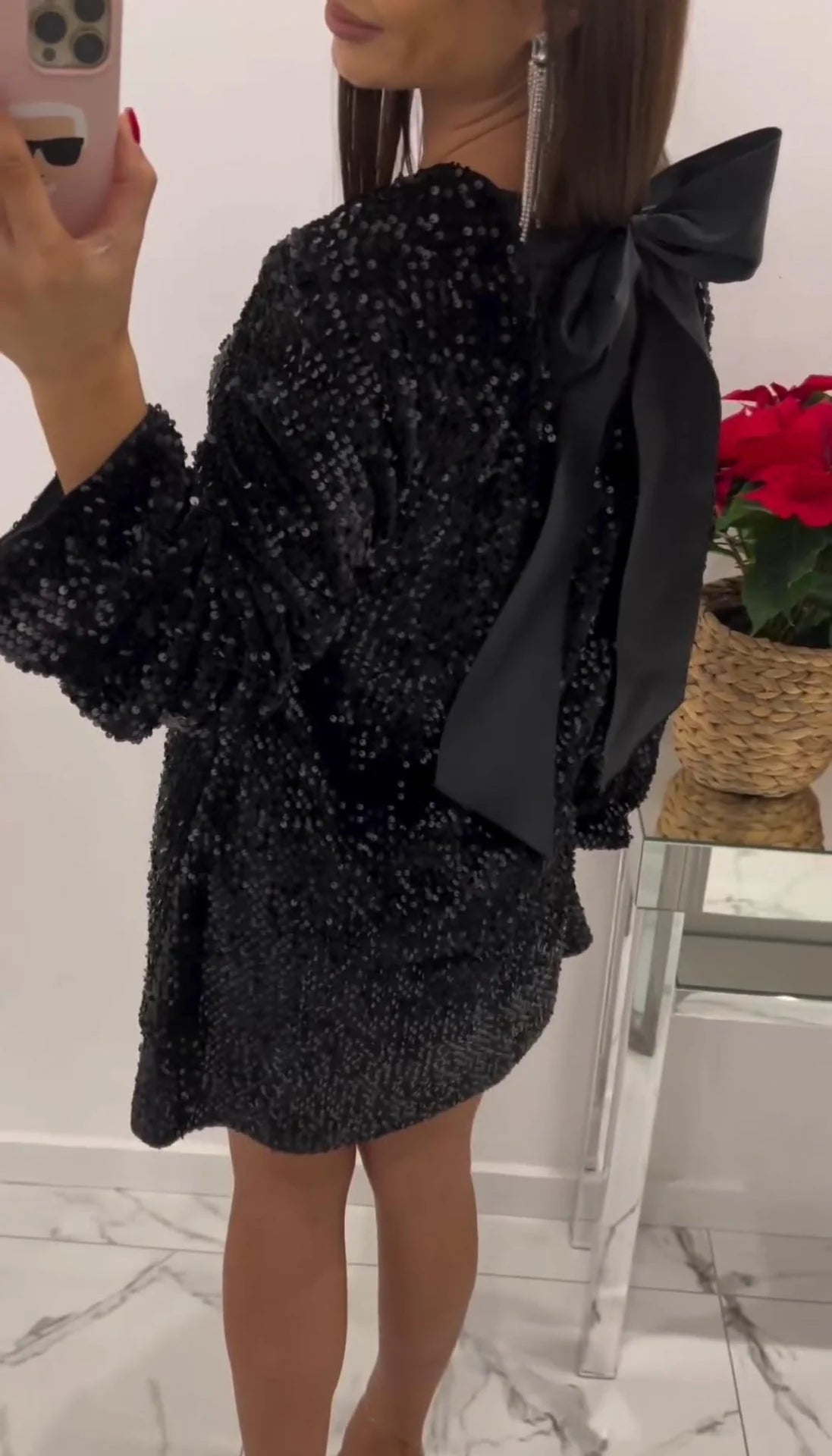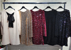 Un abito interamente di paillettes con fiocco sulla schiena in raso in due varianti di colori veste regolare