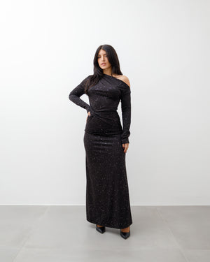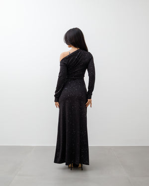 L’abito è un vestito lungo nero, elegante e aderente, realizzato in un tessuto liscio impreziosito da micro dettagli luminosi che creano un delicato effetto scintillante. Il design è monospalla: una spalla rimane scoperta, mentre l’altra è caratterizzata da una manica lunga, donando all’abito un equilibrio raffinato tra sensualità e sobrietà.