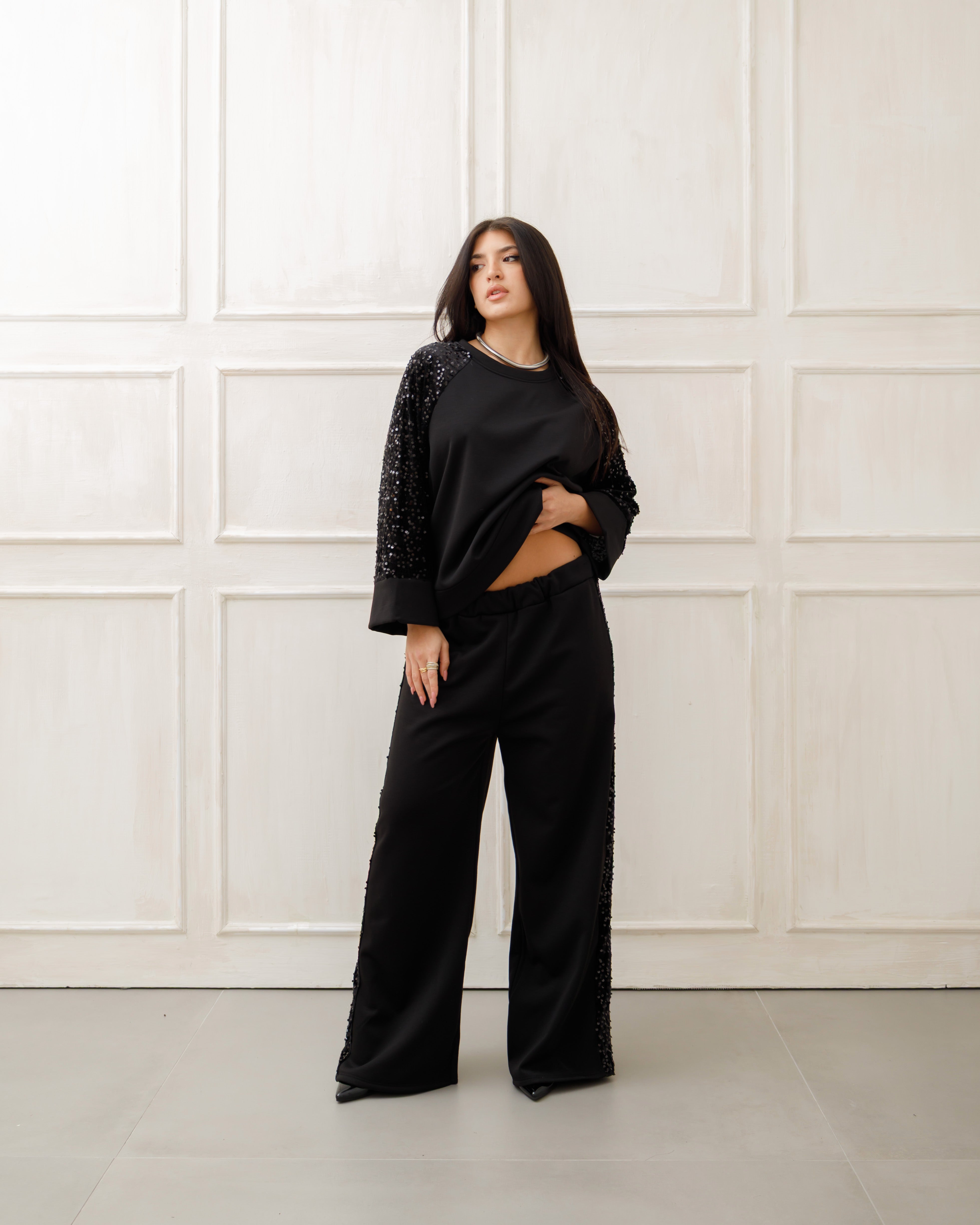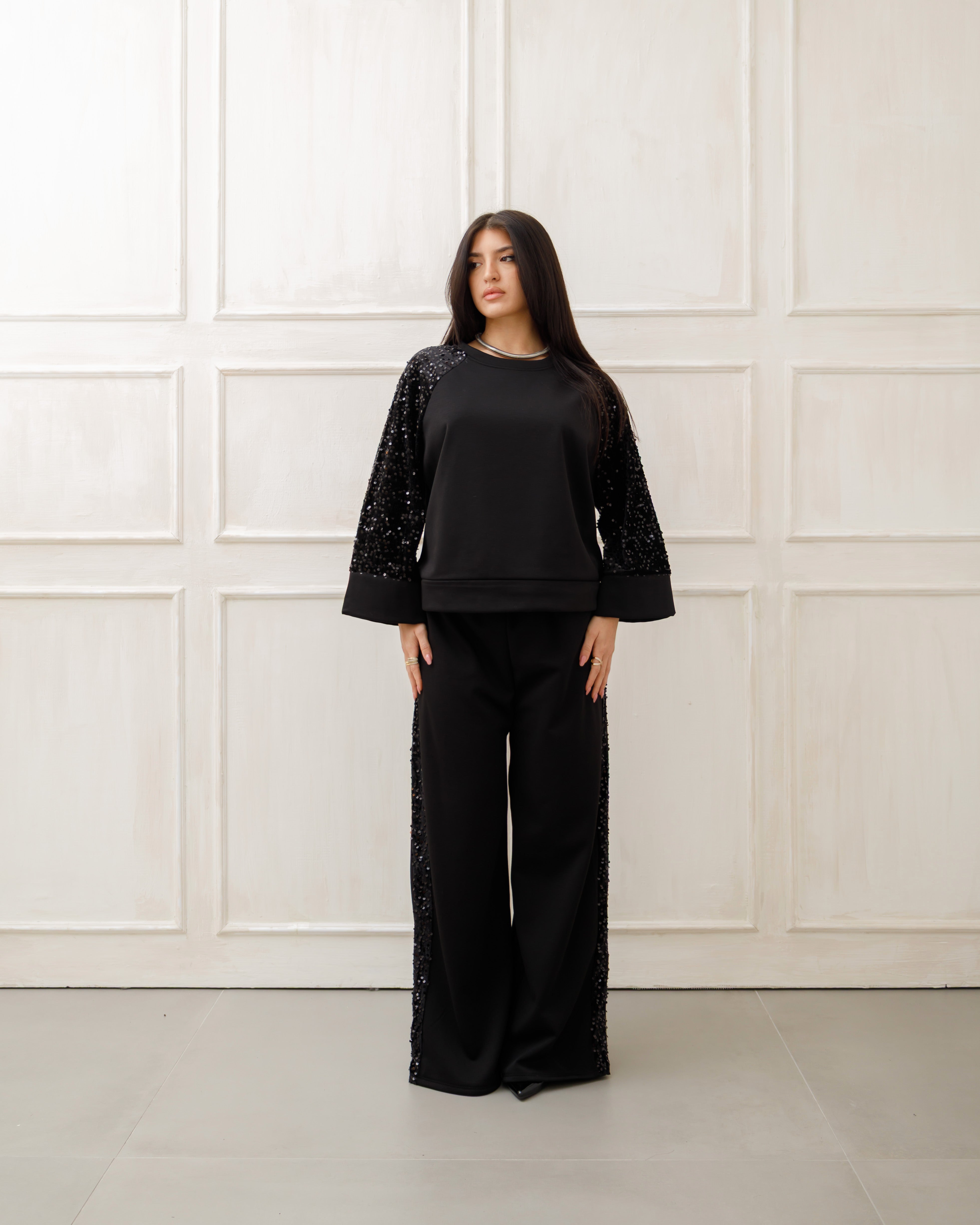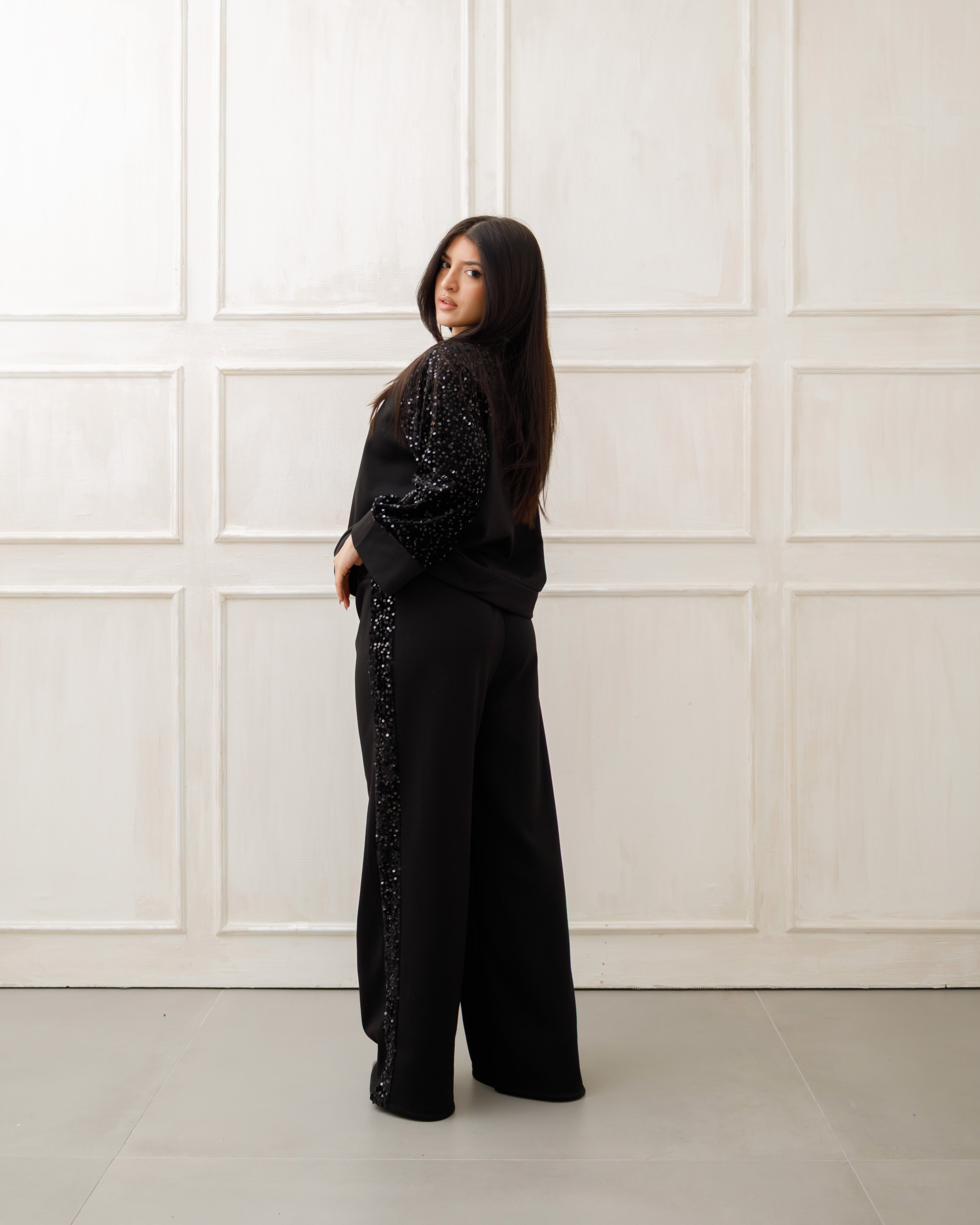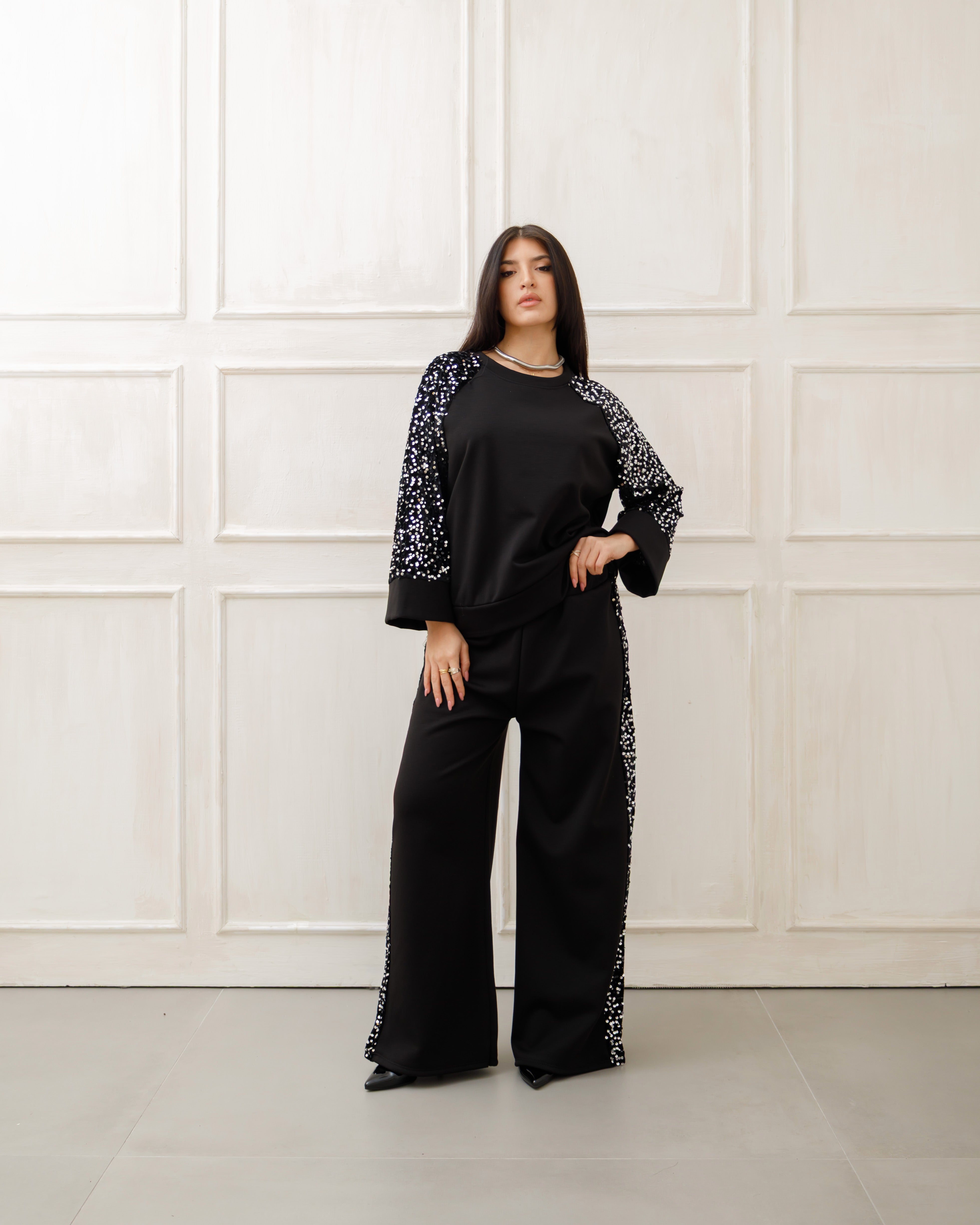 Il design essenziale è valorizzato da inserti in paillettes ✨ lungo le maniche e i lati dei pantaloni, che donano luce, movimento e un tocco glamour senza eccessi 💎.