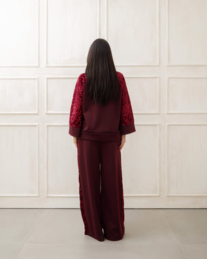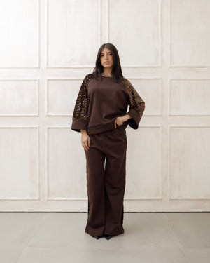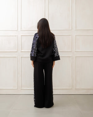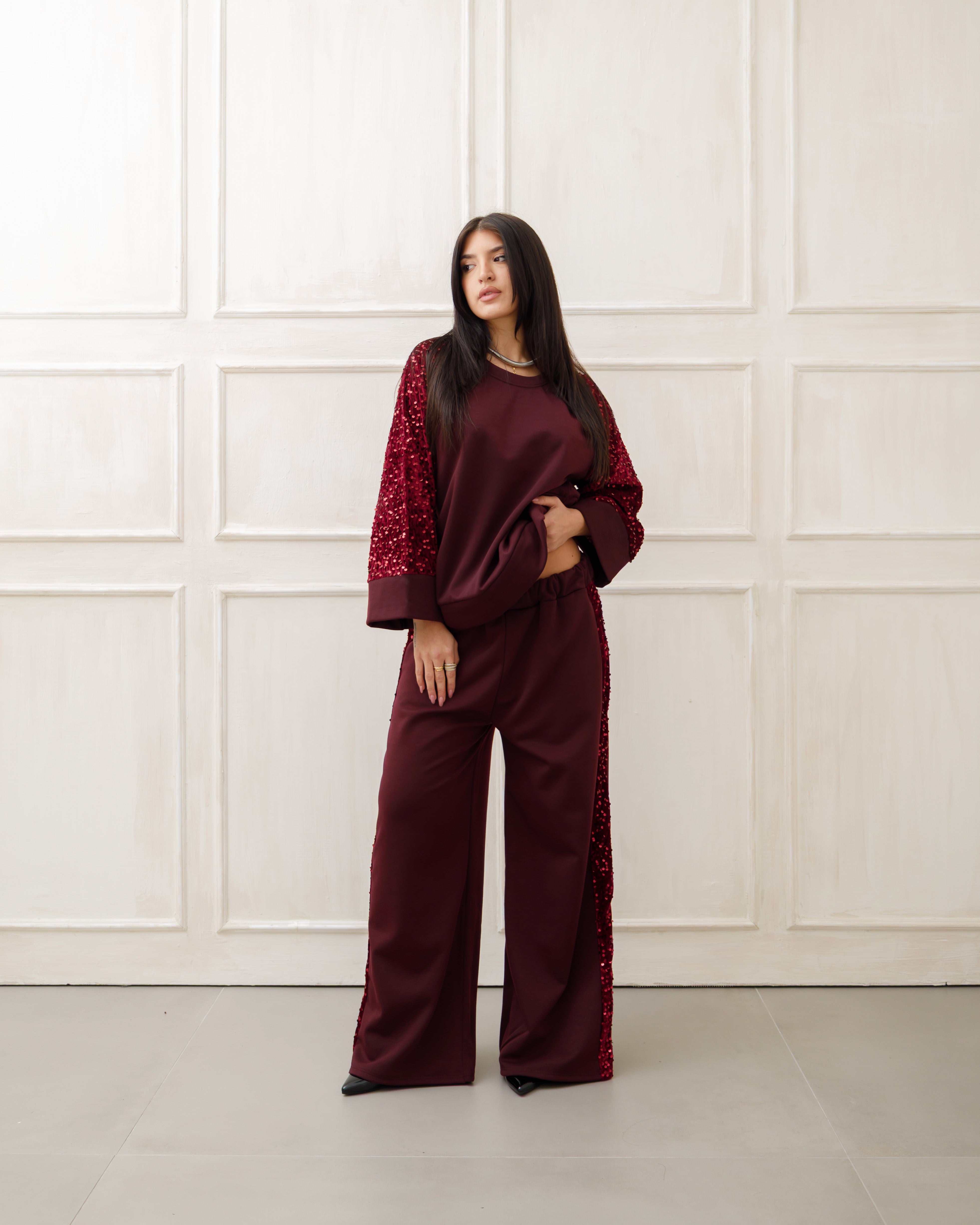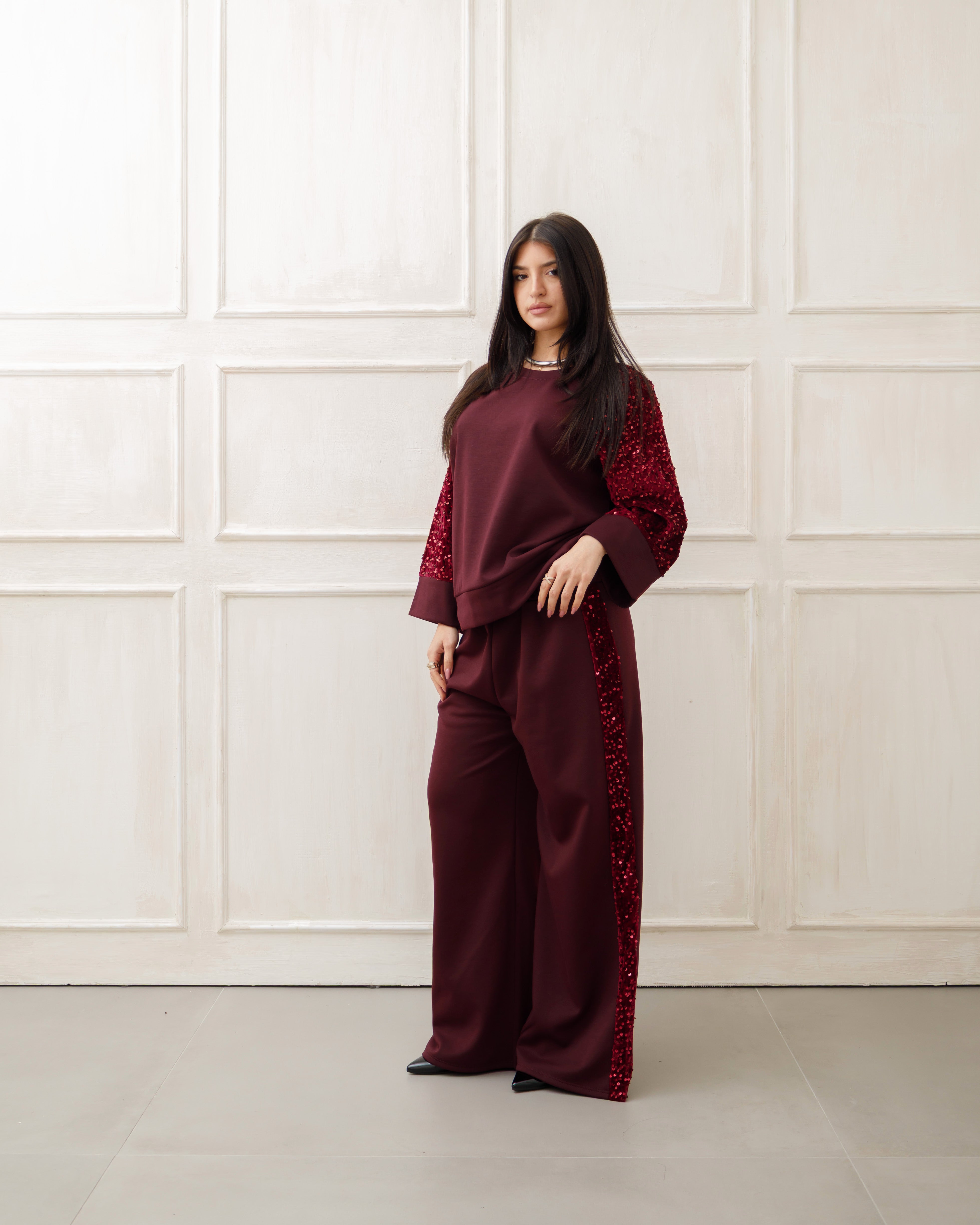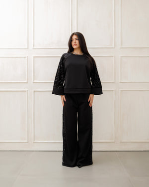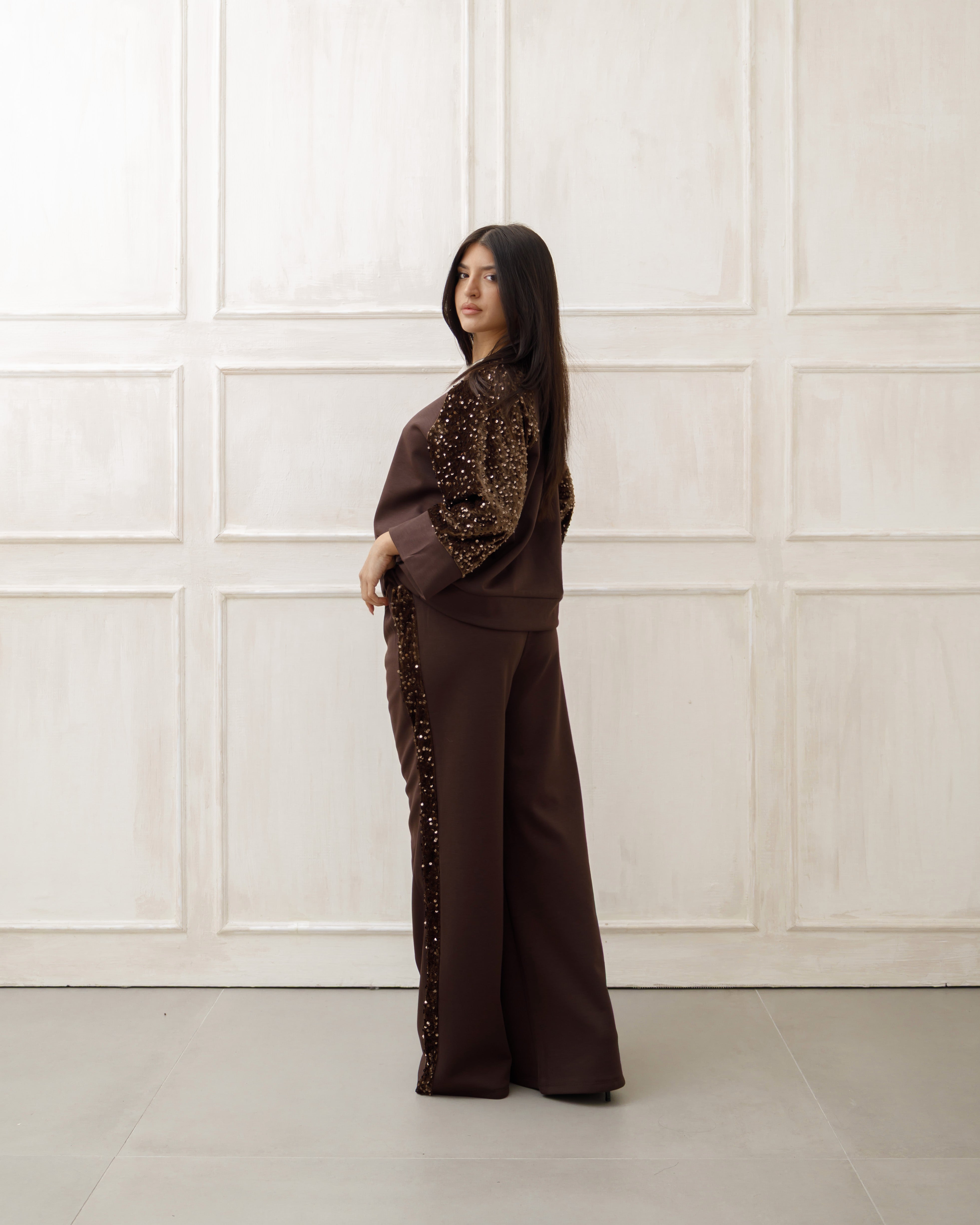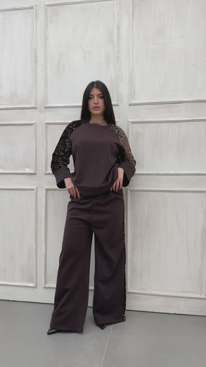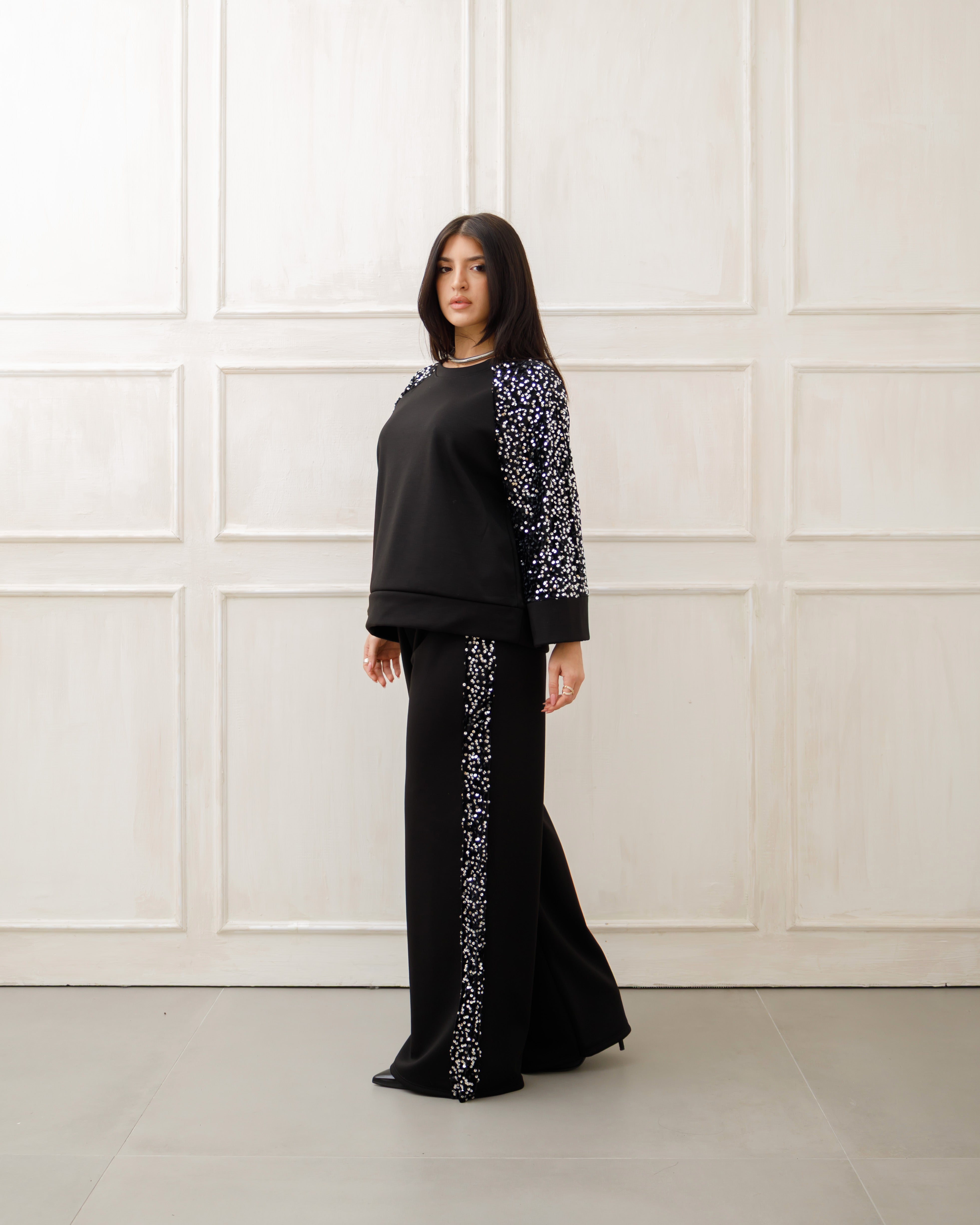 Il design essenziale è valorizzato da inserti in paillettes ✨ lungo le maniche e i lati dei pantaloni, che donano luce, movimento e un tocco glamour senza eccessi 💎.