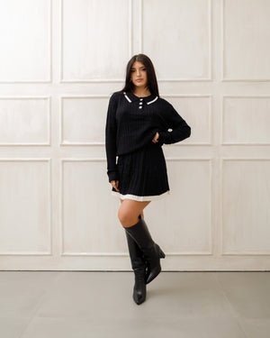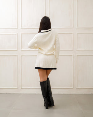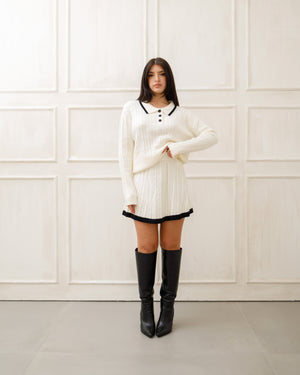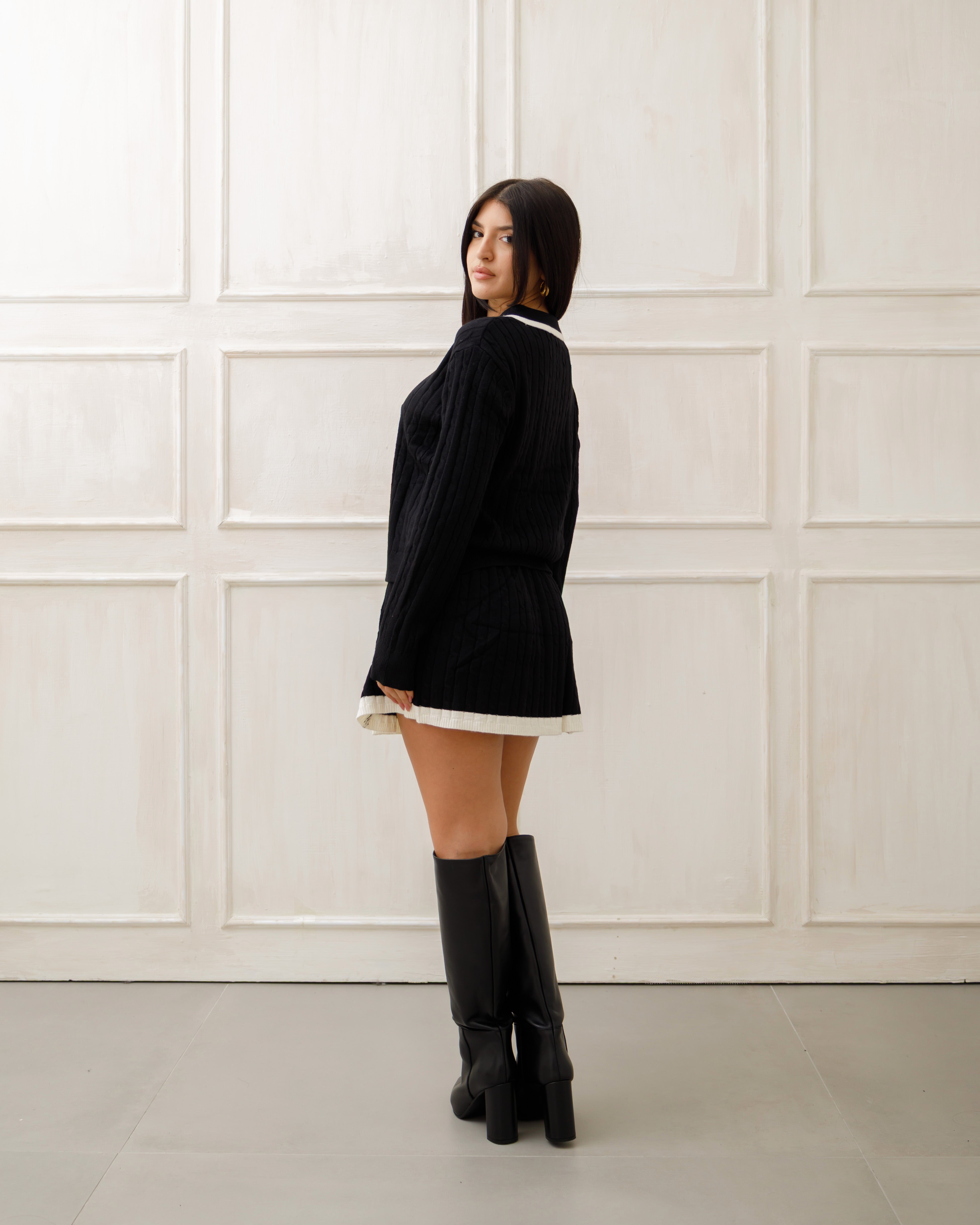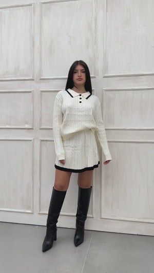 La gonna corta 👗 segue delicatamente le forme ed è rifinita con un bordino a contrasto ✨ sull’orlo, richiamando i dettagli del maglione per un effetto coordinato e curato.