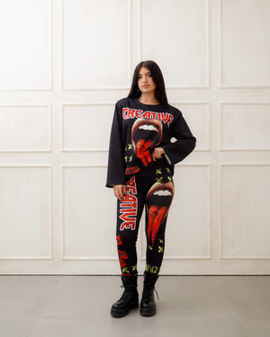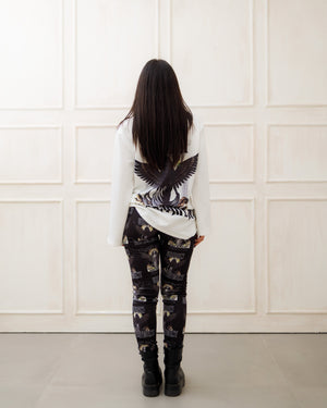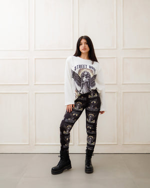 Maglia a maniche lunghe in colore bianco, dal taglio morbido e confortevole, ideale per un look urban e contemporaneo. Il capo è caratterizzato da una stampa frontale di grande impatto con figura alata e scritta “Street Soul”, che dona personalità e carattere all’outfit.