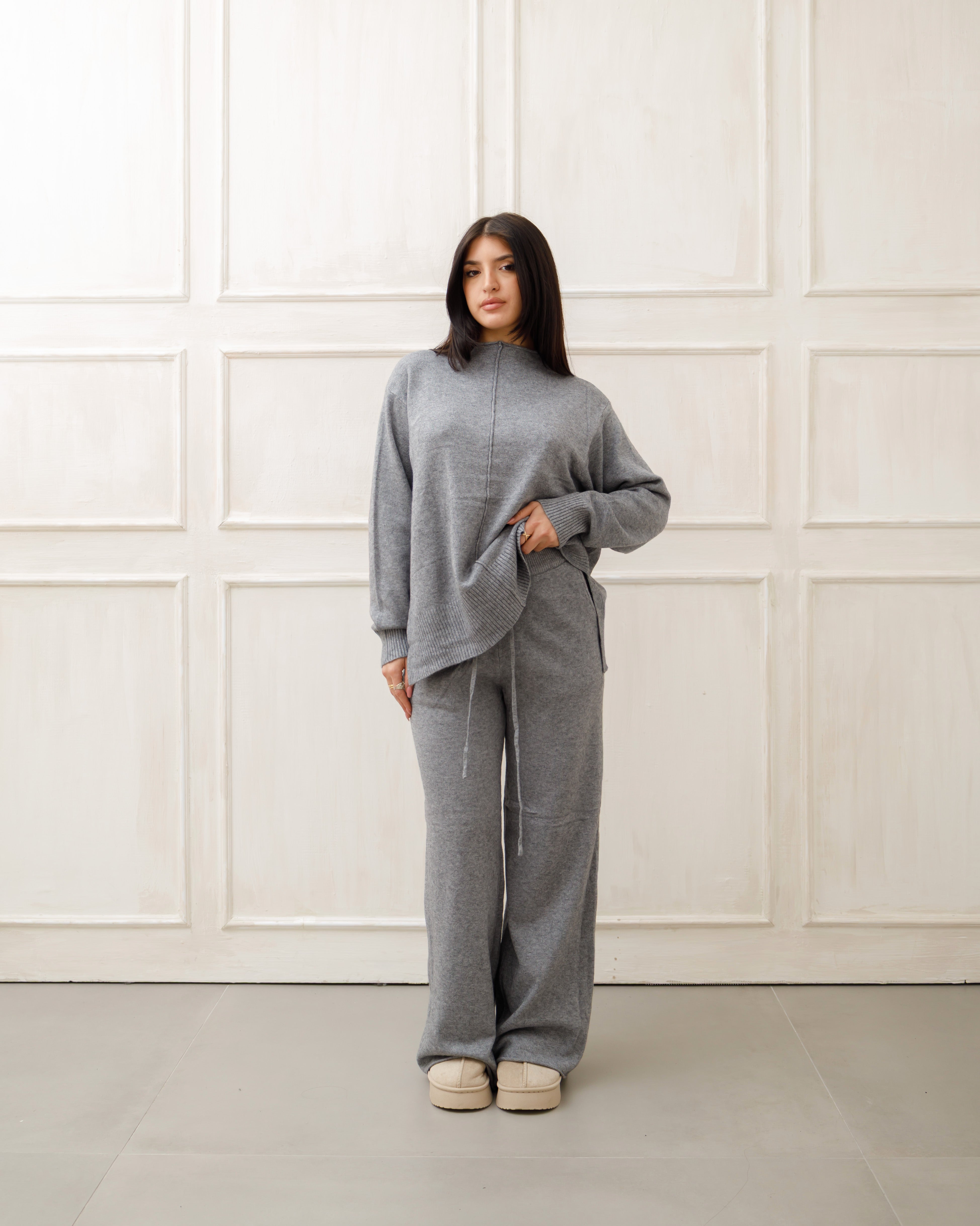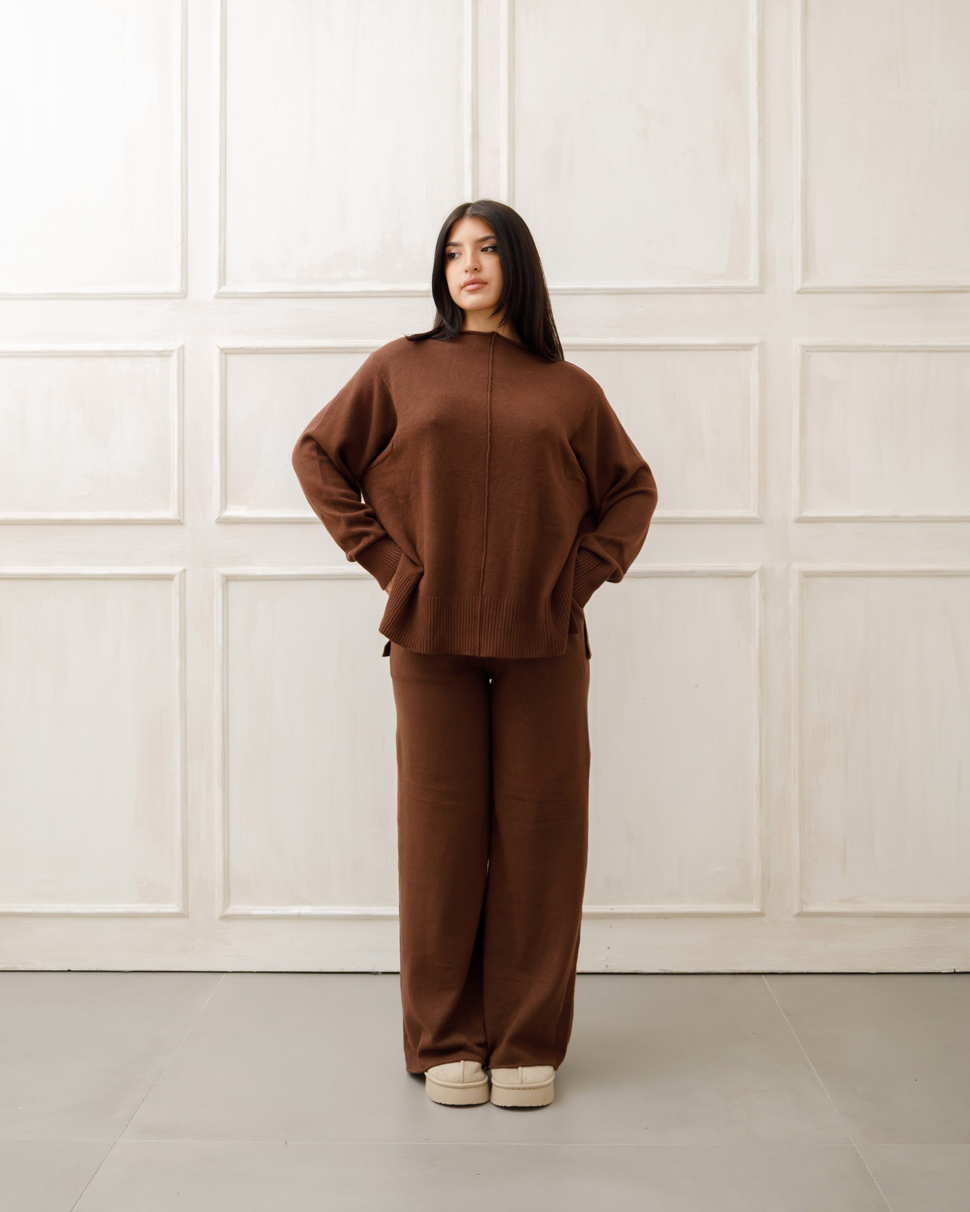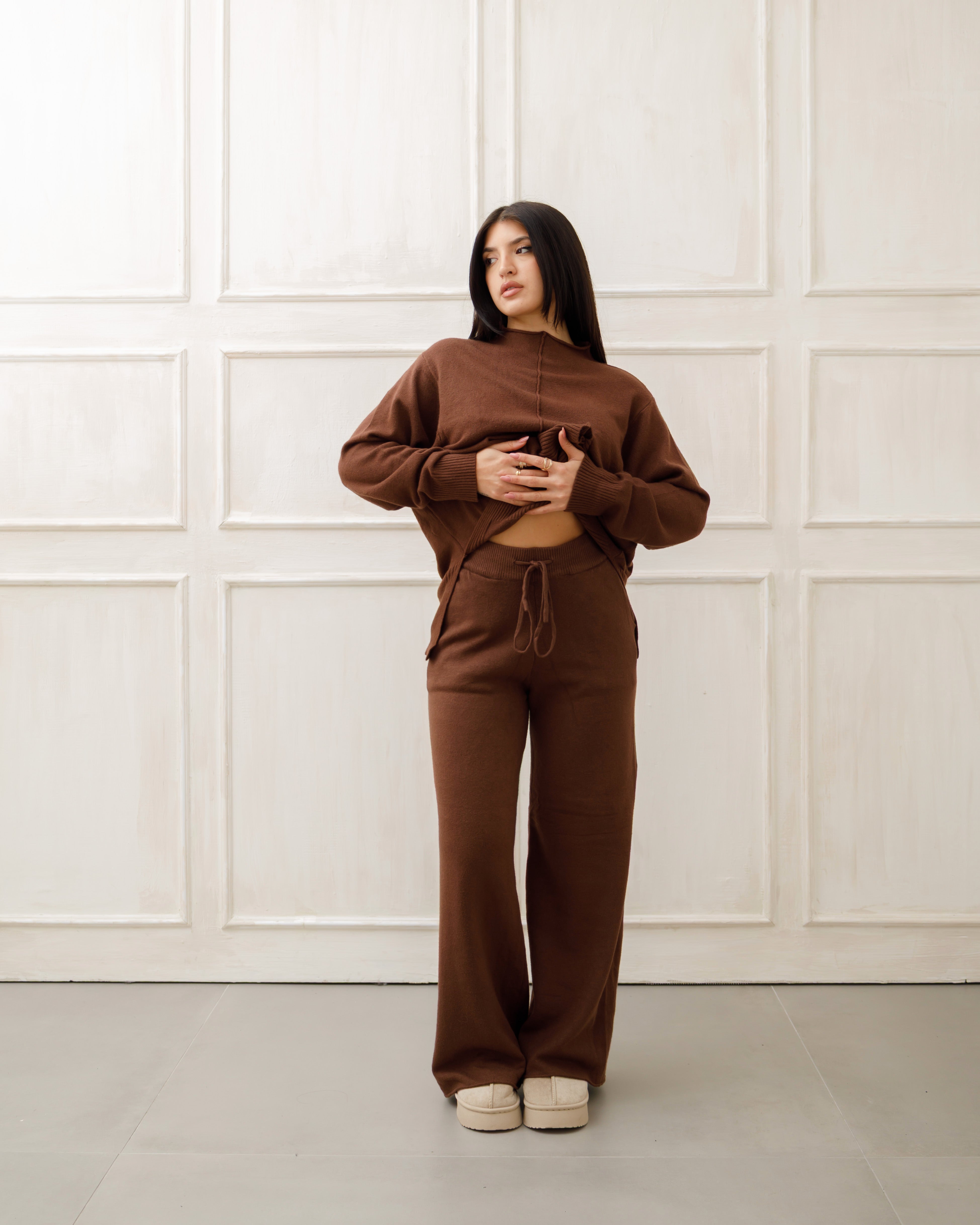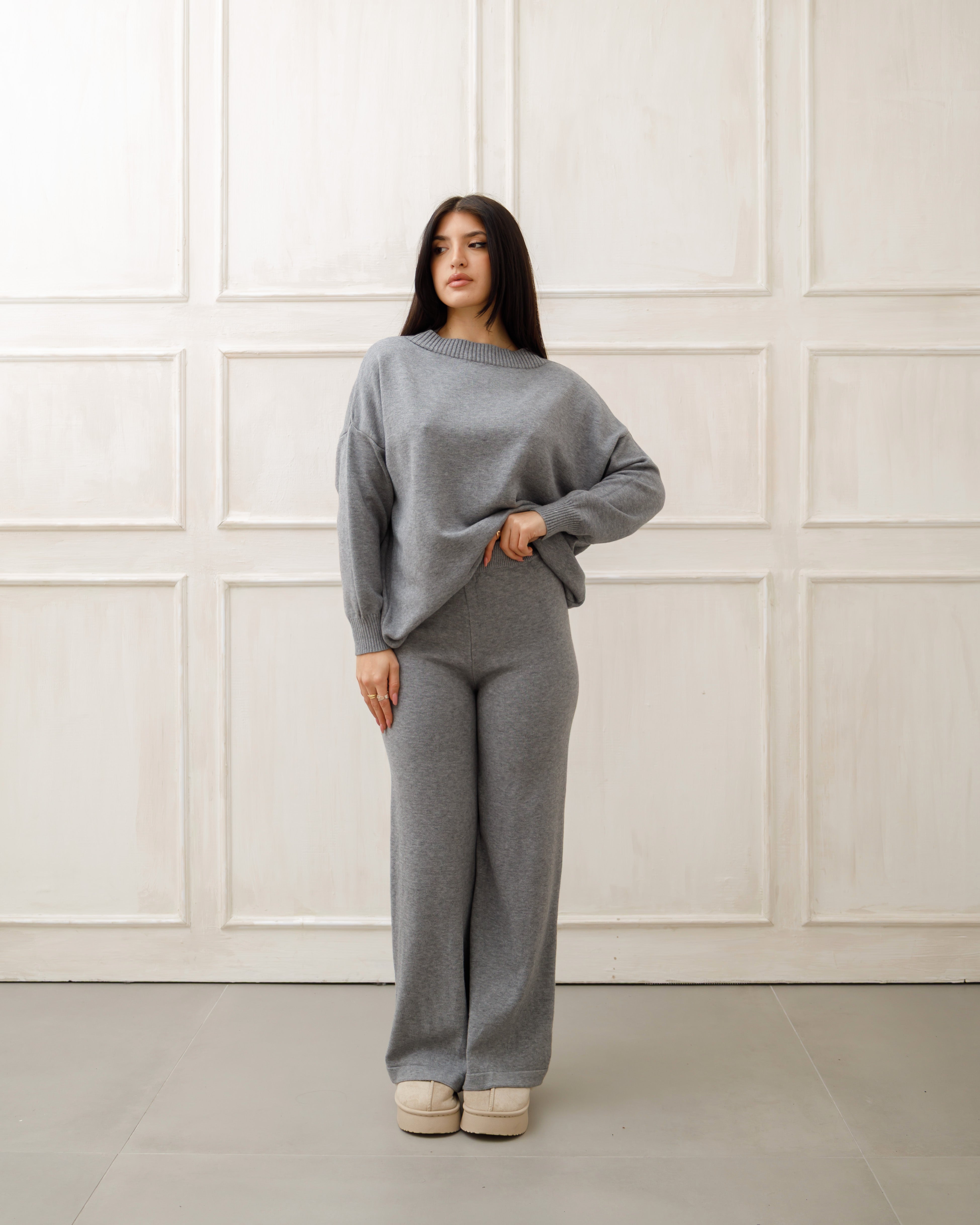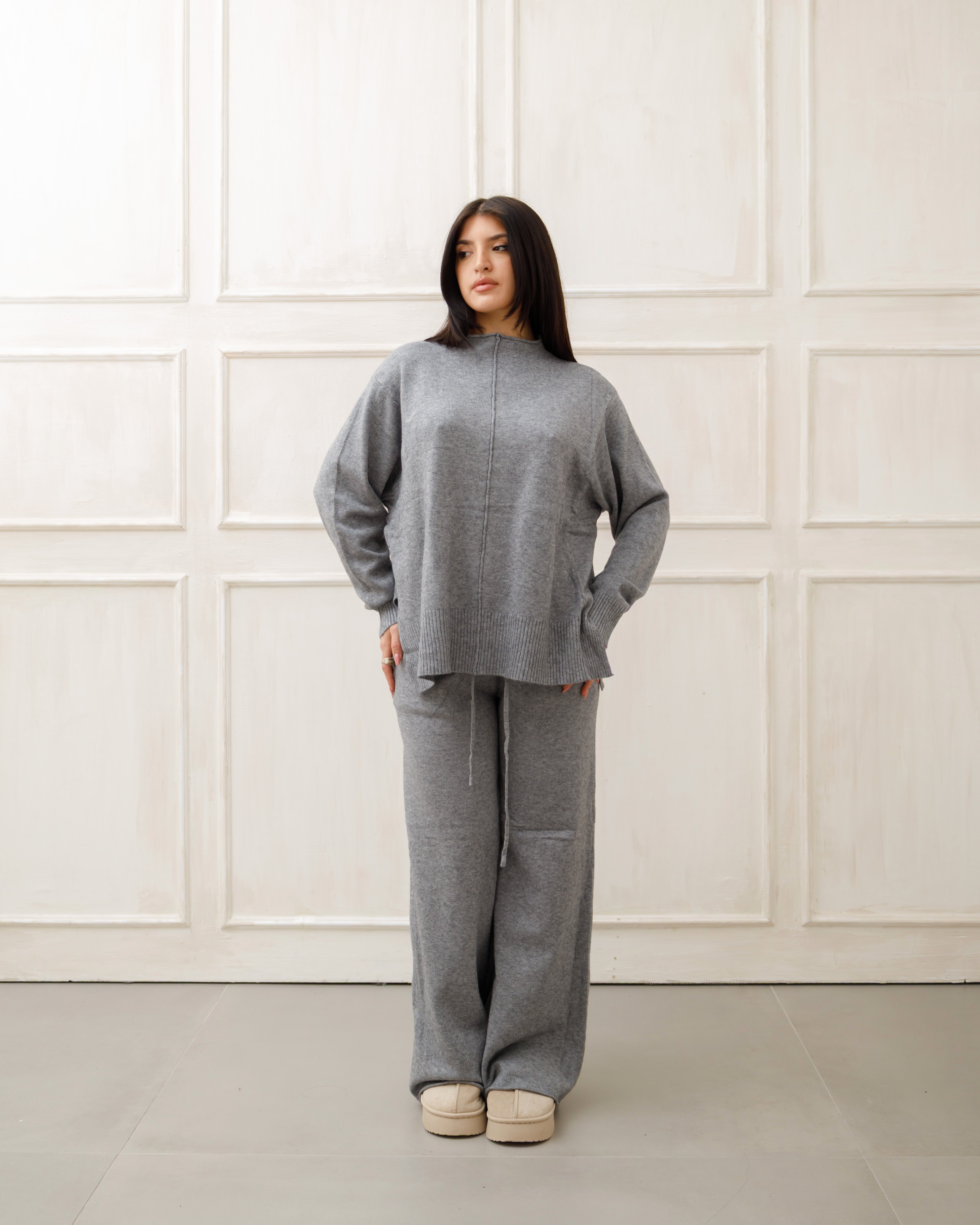 Il soggetto indossa completi in maglia coordinati 🧶 composti da maglione oversize e pantaloni a gamba ampia, pensati per unire comfort ☁️ ed eleganza ✨ in un unico outfit.