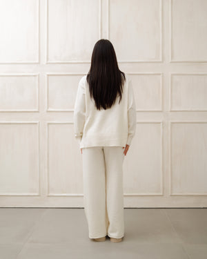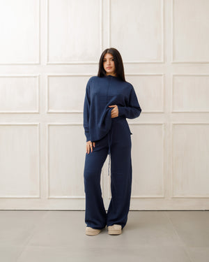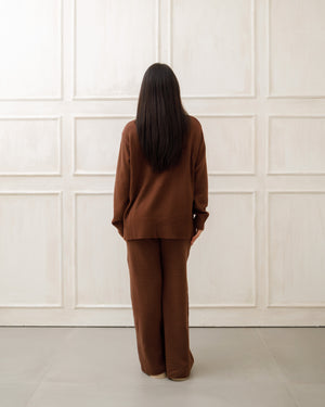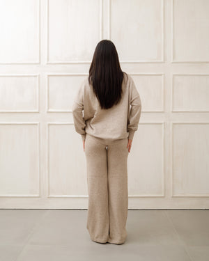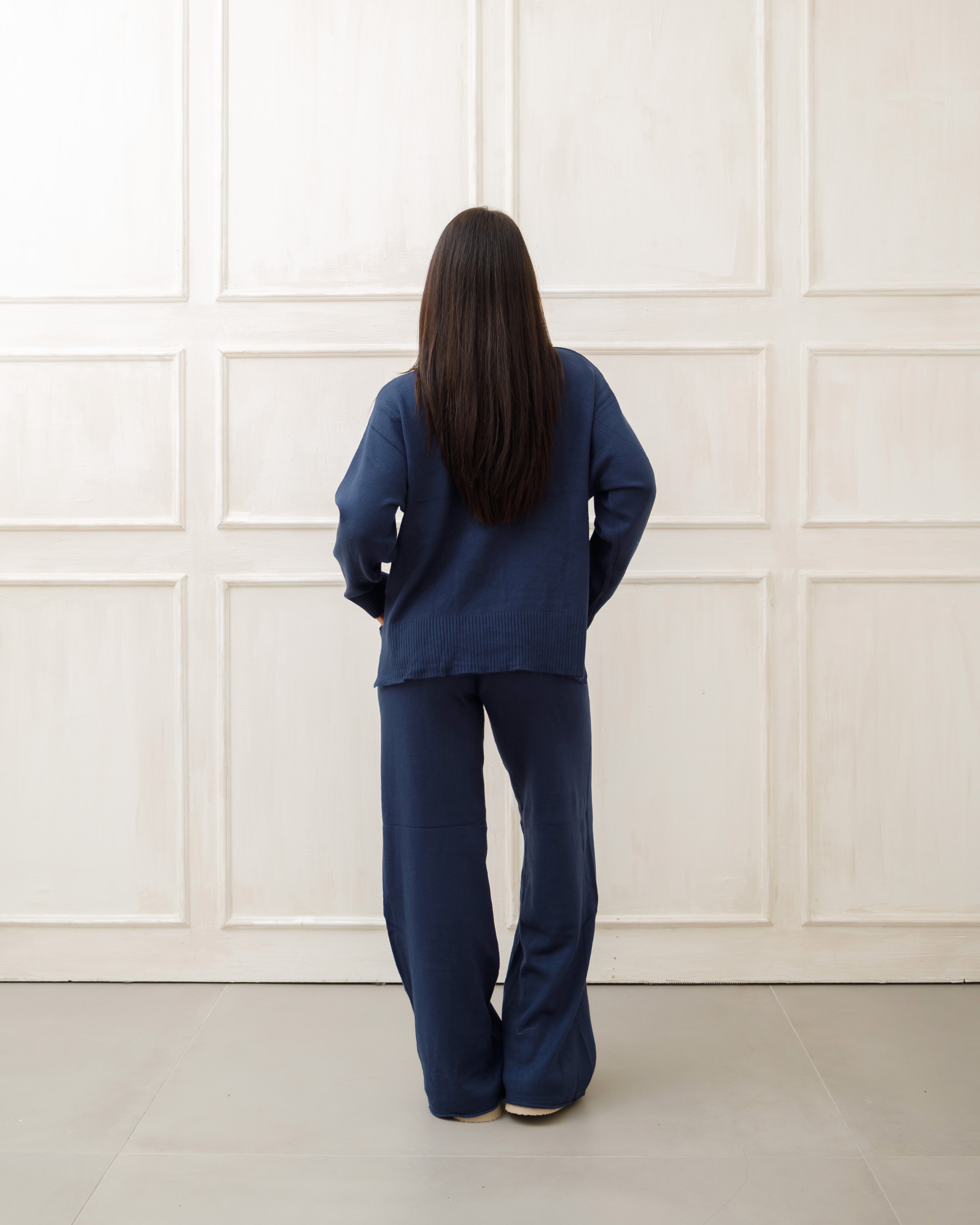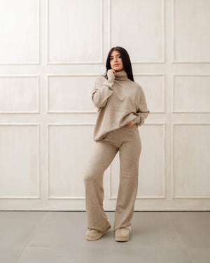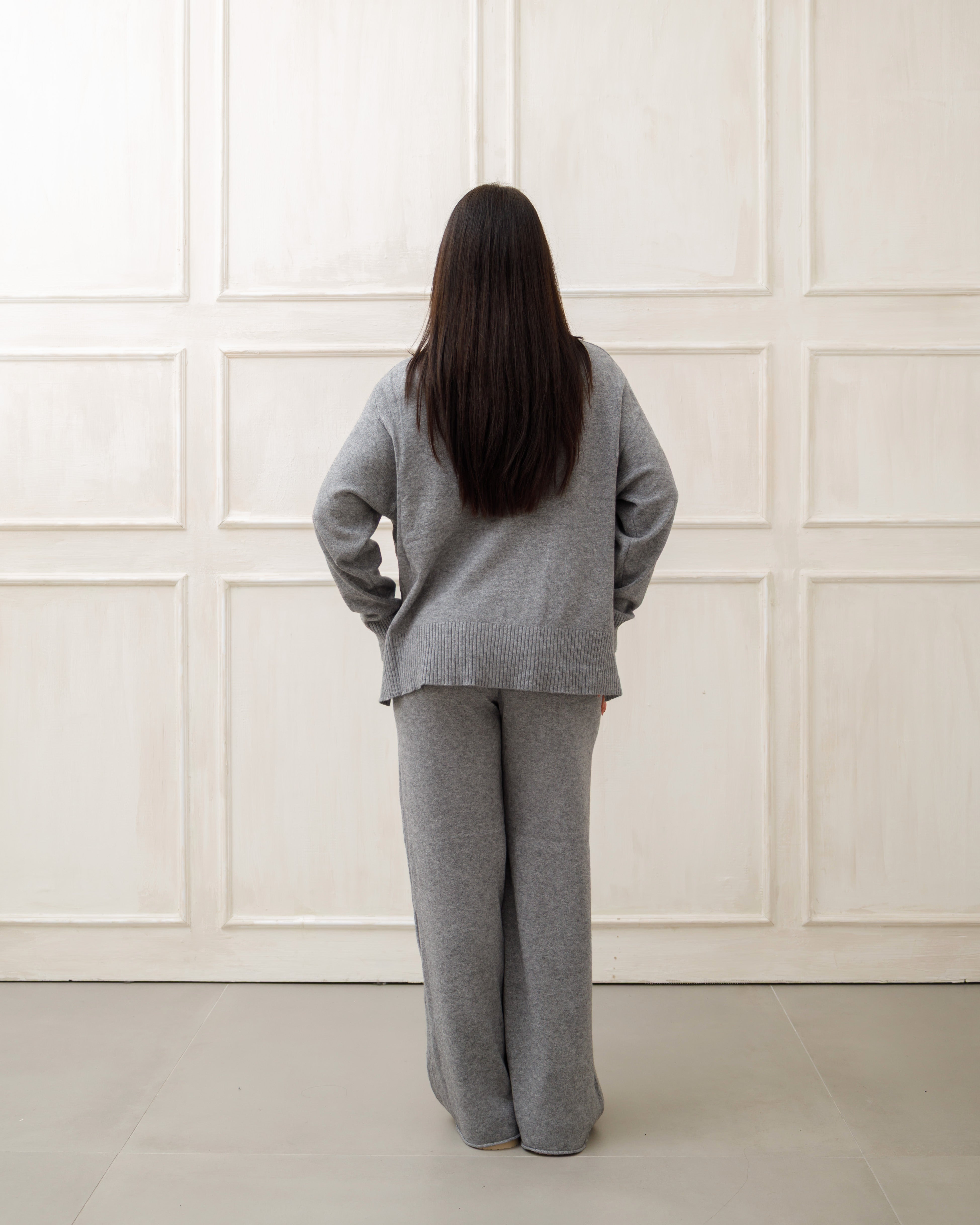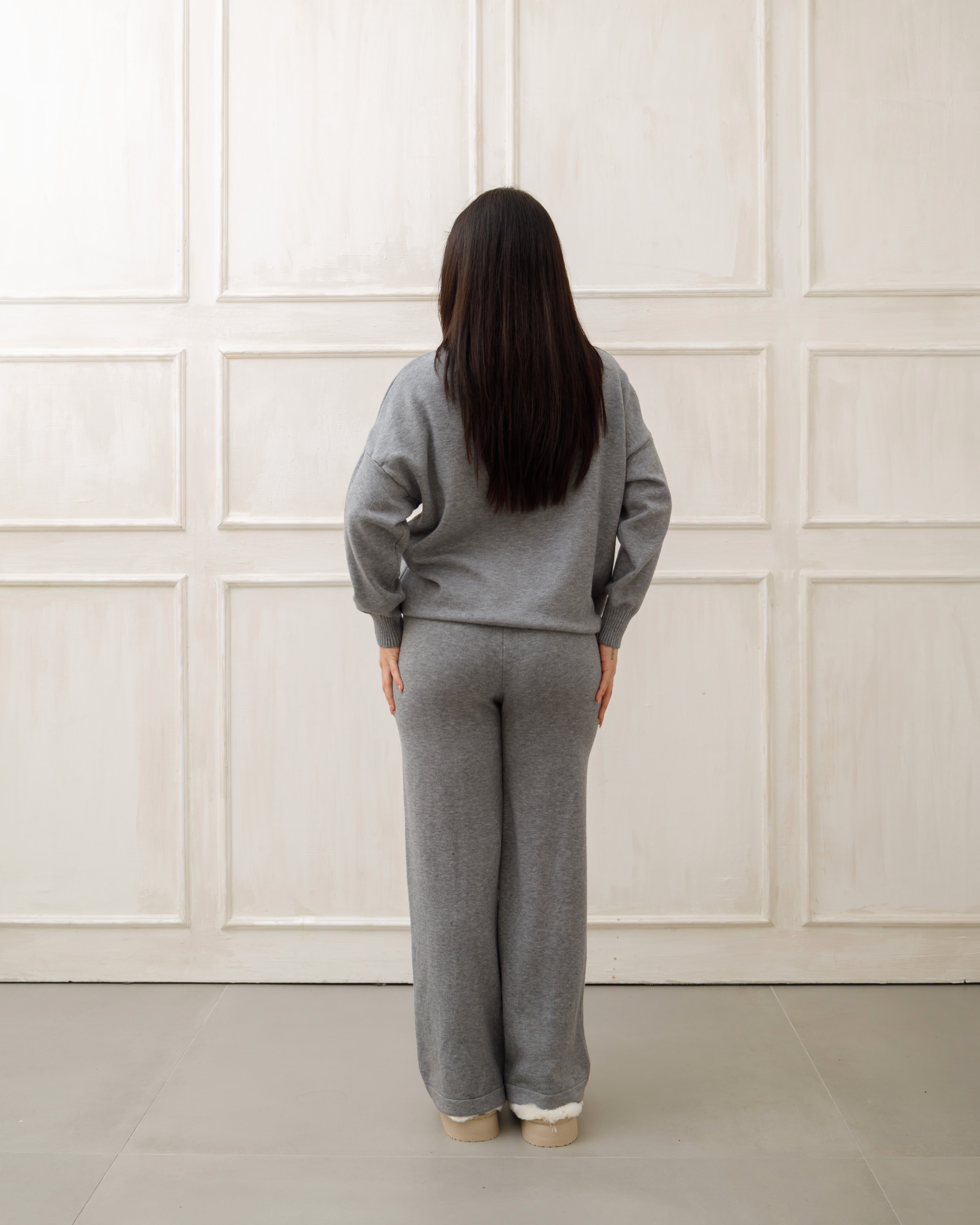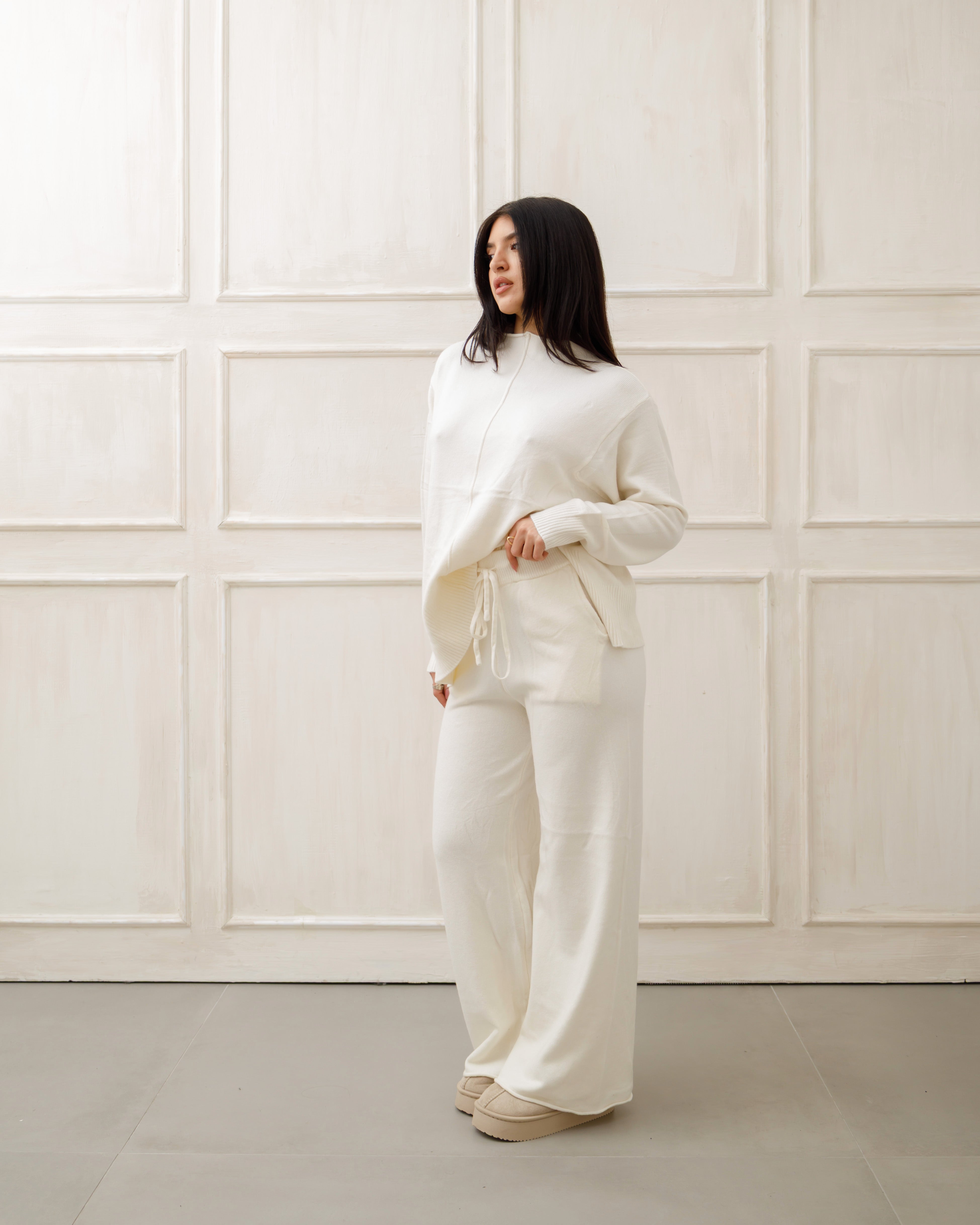 Il soggetto indossa completi in maglia coordinati 🧶 composti da maglione oversize e pantaloni a gamba ampia, pensati per unire comfort ☁️ ed eleganza ✨ in un unico outfit.