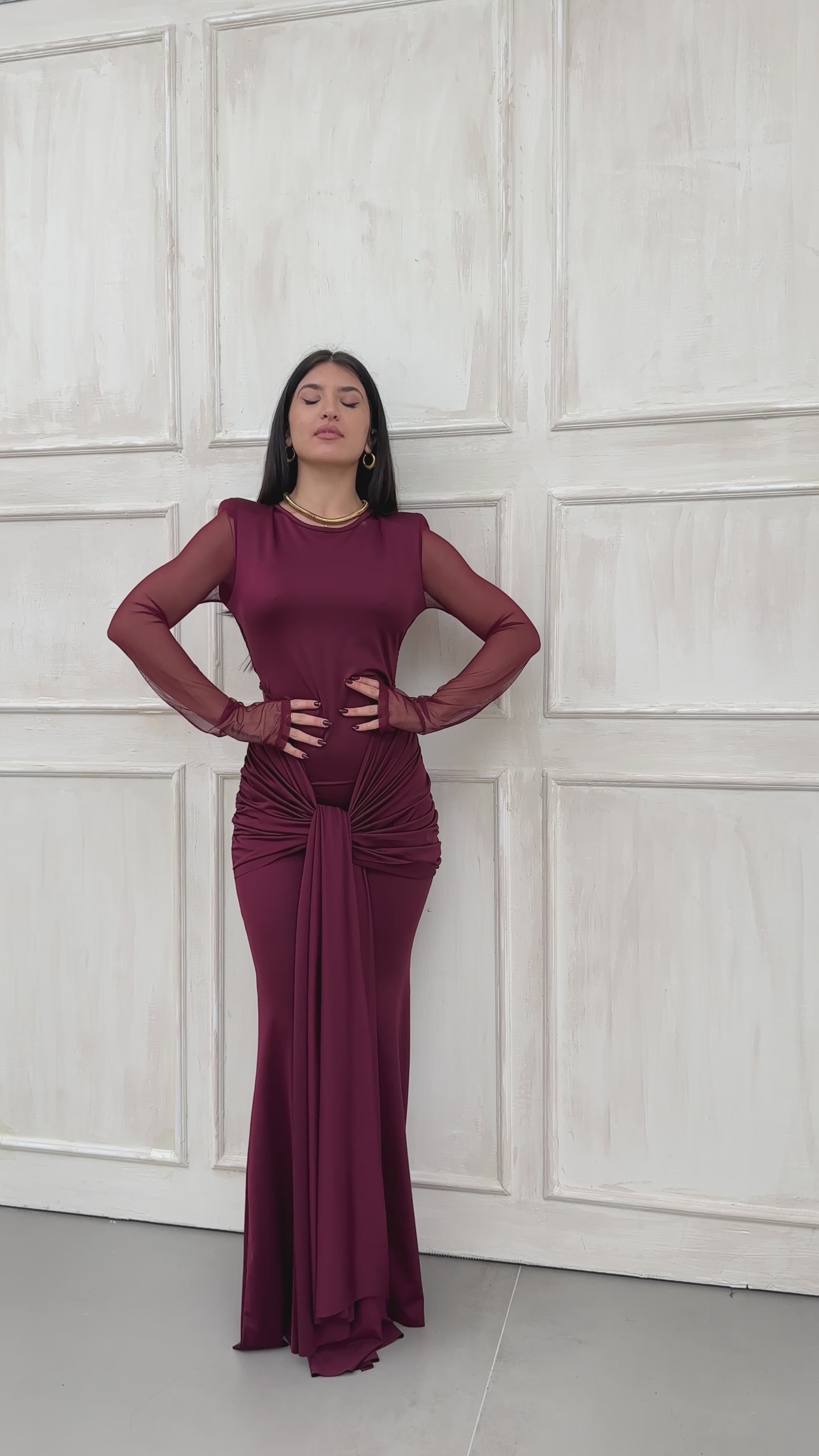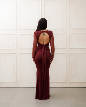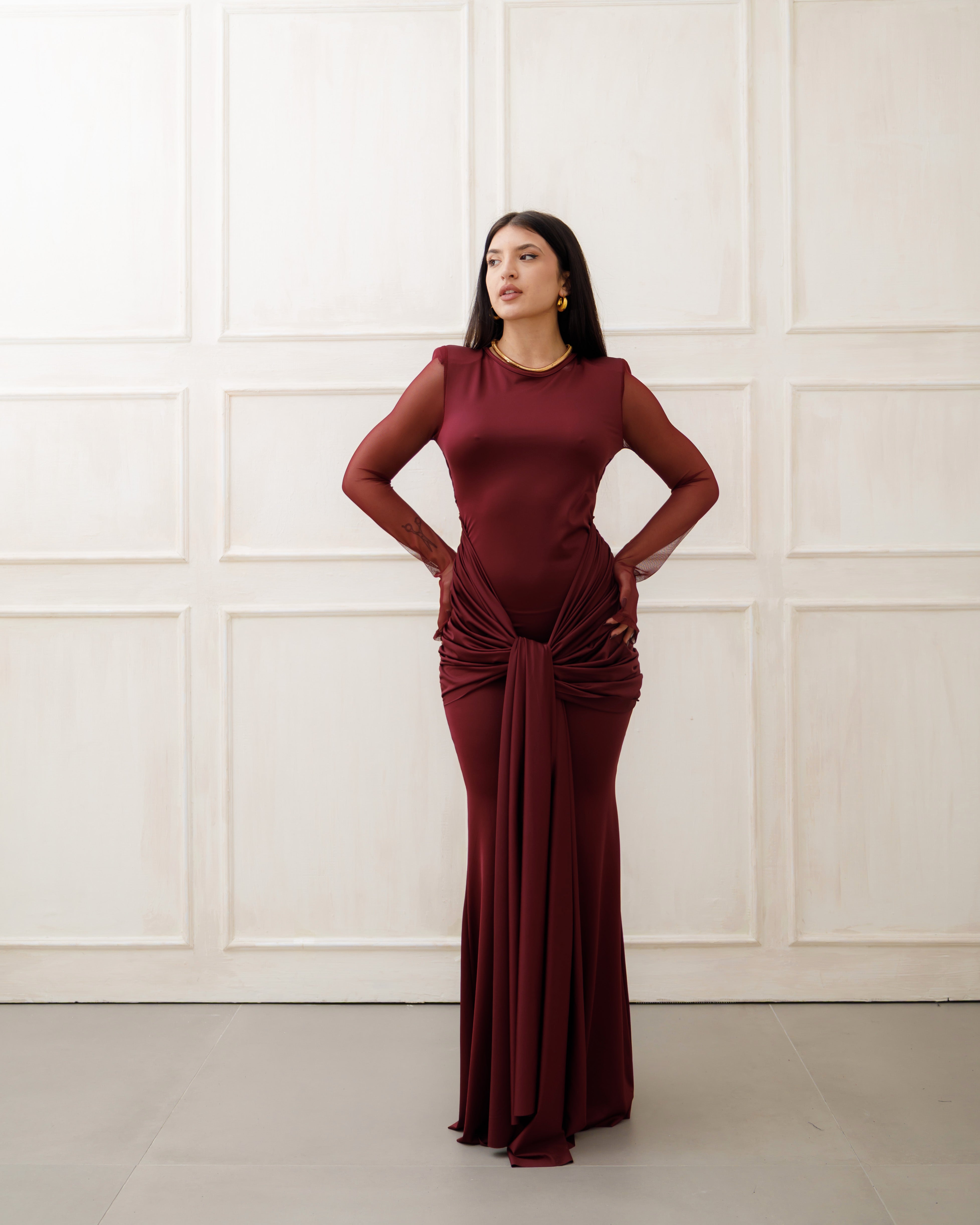 Abito bordò ❤️🍷 dal fascino elegante e sensuale, caratterizzato da una silhouette aderente ✨ che valorizza le forme con raffinatezza. Il design conquista con la scollatura profonda sul retro 🔥, un dettaglio sofisticato e femminile che aggiunge un tocco di audacia. Le maniche lunghe trasparenti 🌙🖤, anch’esse aderenti, creano un raffinato gioco di vedo-non-vedo, donando leggerezza e luminosità all’insieme 💫.