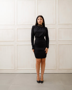 Abito corto aderente dal design elegante e sensuale 💃, realizzato in tessuto elasticizzato che avvolge la silhouette valorizzando le forme 🤍. Il modello presenta maniche lunghe e una linea pulita sul davanti, con un delicato arricciamento in vita che slancia la figura ✨. Il collo alto è impreziosito da un sottile dettaglio decorativo che dona un tocco raffinato e sofisticato 💎.