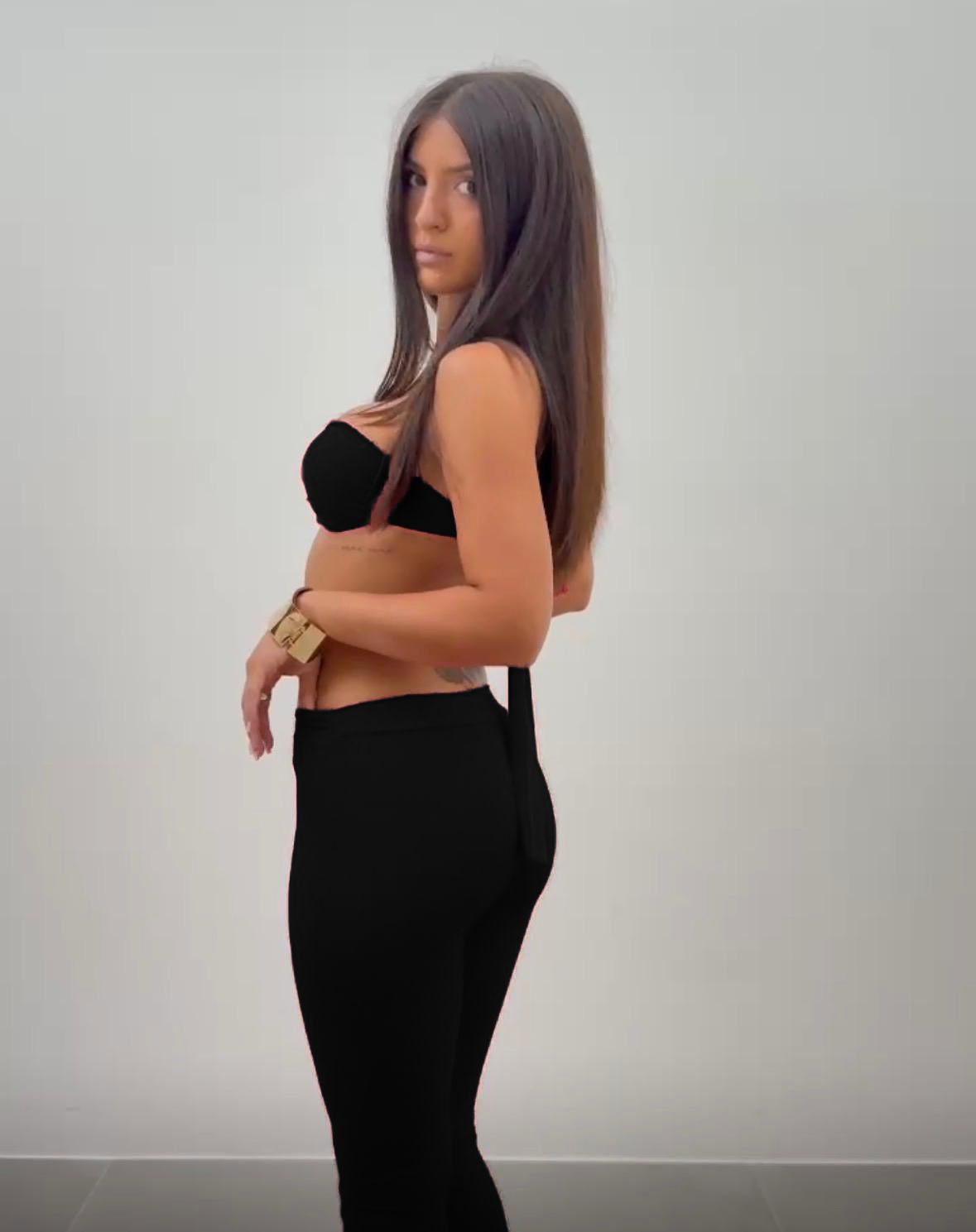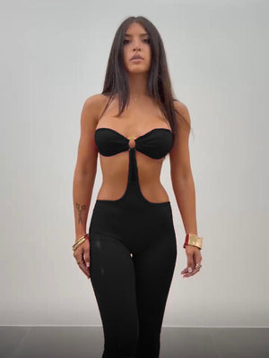 Tuta dal fit aderente che valorizza al massimo le forme ✨ realizzata in tessuto elasticizzato e confortevole. Il top a fascia è impreziosito da un anello centrale dorato 💫 con dettaglio cut-out che mette in risalto il punto vita in modo sensuale ma chic.